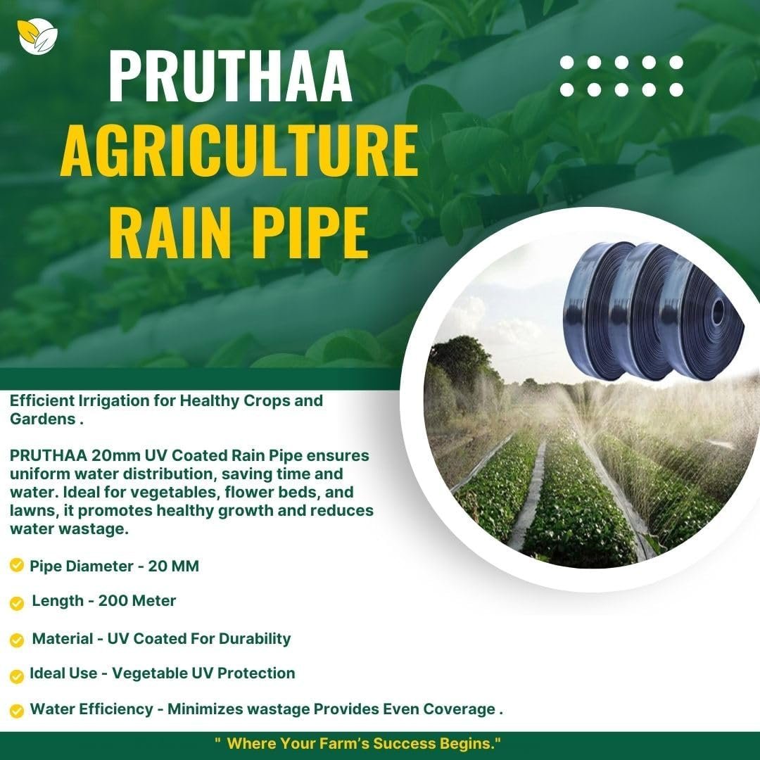 Details: PRUTHAA 20mm UV Coated Rain Pipe, a premium irrigation solution designed specifically for agricultural use, vegetable farming, and garden maintenance. This 200-meter long pipe ensures that your plants receive consistent and efficient watering, promoting healthy growth and optimal yield. Crafted with high-quality UV-coated materials, this rain pipe is built to withstand harsh weather conditions and prevent damage from sunlight exposure. The UV protection not only extends the life of the pipe but also ensures that your irrigation system remains reliable and effective year after year. With a diameter of 20mm, this rain pipe is ideal for delivering the right amount of water directly to the root zones of your plants. Its sturdy construction ensures excellent water flow, minimizing leaks and maximizing irrigation efficiency. Whether you’re nurturing a lush vegetable garden, maintaining a vibrant lawn, or supporting agricultural crops, the PRUTHAA rain pipe is your go-to solution. Installation is quick and straightforward, making it perfect for both seasoned farmers and gardening enthusiasts. The lightweight design allows for easy handling and flexibility, enabling you to customize your irrigation layout to suit your specific needs. Additionally, the rain pipe is compatible with various fittings and accessories, making it versatile for all your gardening and farming projects. Investing in the PRUTHAA 20mm UV Coated Rain Pipe means investing in the health and vitality of your plants. Experience the difference in your garden or farm as this reliable irrigation system helps conserve water, reduce runoff, and ensure that every drop counts. Choose PRUTHAA for quality, durability, and performance. Transform your gardening experience and achieve thriving plants with our exceptional rain pipe. Perfect for homeowners, landscapers, and agricultural professionals alike, it’s time to elevate your irrigation game with PRUTHAA .