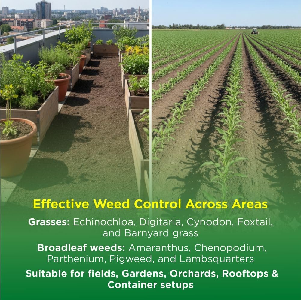 - ๐ฏ๐ฟ๐๐๐ซ๐ ๐๐ญ ๐๐๐๐๐ฌ: Shinobi effectively controls both grassy and broadleaf weeds, including common problem species such as Echinochloa spp., Digitaria spp., Cynodon spp., Amaranthus spp., Chenopodium spp., and Parthenium spp. Its pre-emergence action prevents germination and early growth, helping maintain a clean, weed-free field for optimal crop establishment. Suitable for cereals, pulses, vegetables, and plantation crops, it works across large fields, small plots, and container setups.