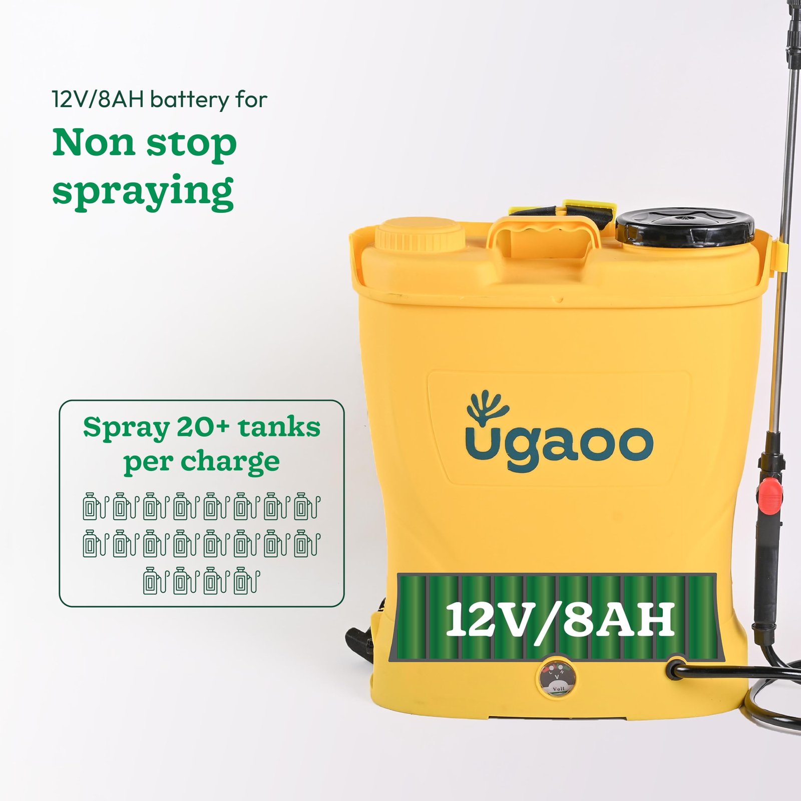 Details: The Ugaoo Agriculture Spray Machine is your reliable partner for efficient crop protection and care. Designed as a heavy-duty battery sprayer for agriculture, it delivers unmatched power, comfort, and performance for every farm task. Whether you’re spraying pesticides, fertilizers, or foliar nutrients, this agriculture spray pump ensures even coverage and consistent pressure every time. With a 12V/8AH rechargeable battery, this spray machine for agriculture battery provides long hours of uninterrupted use. The 3.6L/min autocut pump maintains perfect flow and automatically shuts off to prevent overpressure – a smart feature rarely found in regular spray pumps for agriculture. Built for Indian conditions, this sprayer for agriculture combines a stainless steel telescopic lance, durable plastic trigger, and best-in-class padded straps to give you a fatigue-free spraying experience. The ergonomic design of this agriculture spray pump ensures easy handling, making it ideal for farms, gardens, nurseries, and orchards. Use it as a pesticide sprayer, a power sprayer for agriculture, or a fertilizer sprayer – it’s versatile enough for every job. With 4 interchangeable nozzles and a precision regulator, this battery sprayer for agriculture allows fine mist or heavy coverage as needed. Backed by Ugaoo’s trusted quality, this agriculture spray pump is engineered to last for years of dependable use. From crop care to pest control, this agriculture spray pump makes your work faster, easier, and more effective – truly the best spray machine for agriculture battery in its class.