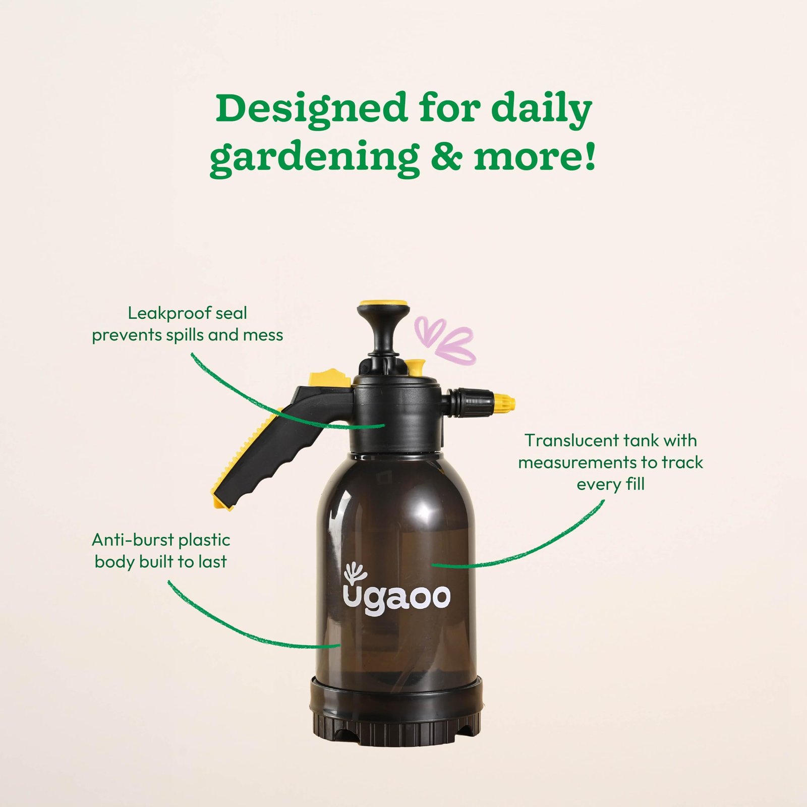 Details: The Ugaoo Pressure Spray Pump is a versatile and efficient tool for watering plants, fertilizing, and pest control in gardens, balconies, and agricultural spaces. Designed for ease of use, this spray pump for garden delivers precise and consistent spraying, making plant care effortless. Equipped with a special brass nozzle, this pump spray allows you to adjust the spray pattern from a targeted stream to a fine mist, ensuring optimal coverage for delicate and large plants alike. The ergonomic handle offers a comfortable grip, reducing hand fatigue during extended use. Built with high-quality materials, this pressure spray pump is durable, long-lasting, and resistant to wear and tear. The graduated bottle features clear level markings, making it easy to monitor liquid volume, while the locking mechanism allows for continuous spraying without the need for constant pressure on the handle. Whether you need a spray pump for garden plants, a pump spray for fertilizers, or a pressure spray pump for pest control, the Ugaoo Spray Pump is the ideal choice for every gardener.